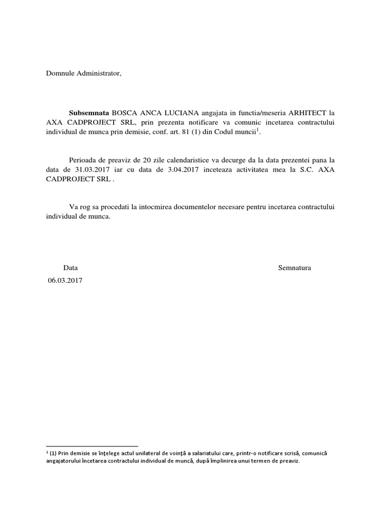 Pe durata preavizului contractul individual de munca continua sa isi produca toate efectele. Demisia in perioada de proba. Preavizul la demisie și la concediere este tratat în legislația muncii ca un beneficiu pentru angajator respectiv ca un beneficiu pentru salariat. 81 demisia 1 prin demisie se înţelege actul unilateral de voinţă a salariatului care printr o notificare scrisă comunică angajatorului încetarea contractului individual de muncă după împlinirea unui termen de preaviz.
