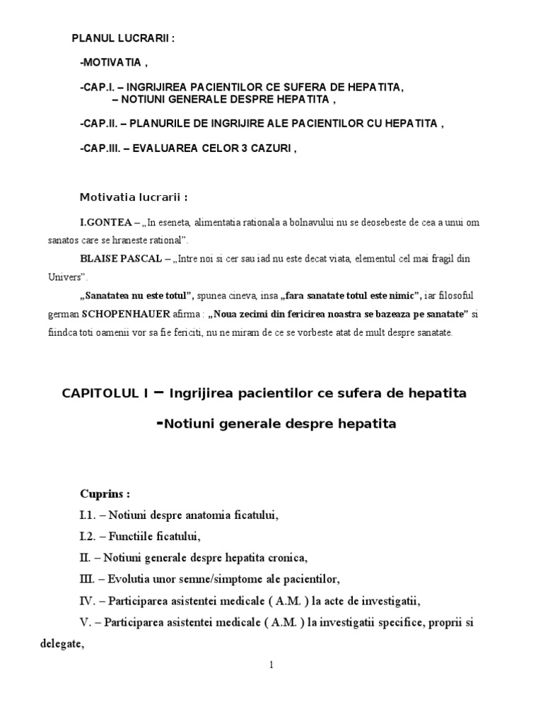 Hepatita a poate fi neplăcută dar de regulă nu reprezintă o afecţiune cu adevărat serioasă şi majoritatea oamenilor se recuperează complet în decursul câtorva luni. Dintre subiectii cu infectie cronica virala b 40 60 au replicare virala activa iar la 5 10 exista riscul dezvoltarii cancerului hepatocelular. Iti recomandam sa te uiti bine pe extras cuprins si pe imaginile oferite iar daca este ceea ce ti trebuie pentru documentarea ta il poti descarca. Ingrijirea bolnavilor cu hepatita cronica.