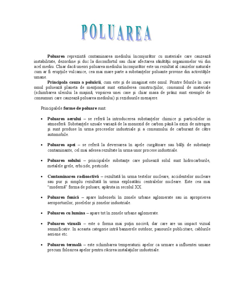 Poluarea aerului referat chimie. Poluarea aerului prin produsele gazoase ale arderii ca rezultat al progreselor din industrie agricultura si tehnologie se creeaza cantitati tot mai mari de noi deseuri solide deseurile menajere si apele reziduale polueaza mediul si in unele locuri nivelele de poluare sunt periculos de ridicate. Poluarea apei si a aerului referat la chimie mai jos o sa aveti mai multe rezultate pentru cautarea poluarea apei si a aerului referat la chimie. Poluarea este contaminarea mediului înconjurător cu materiale care interferează cu sănătatea umană calitatea vieții sau funcția naturală a ecosistemelor organismele vii și mediul în care trăiesc. Referatul poluarea apei chimie generala pentru facultate uploadat in biblioteca regielive id 302847.