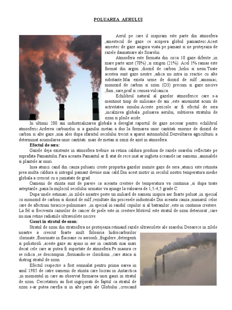 Poluarea aerului si praguri nocive termenul de poluare a aerului presupune un anumit tip de noxe atmosferice de la care poate fi observata o variatie acalitatii acestuia. 2 1 poluarea aerului acțiunea umană asupra atmosferei pământului poate lua multe forme și a existat de când oamenii au început să utilizeze focul pentru agricultură încălzire și gătitul alimentelor. în timpul revoluției industriale secolele xviii și xix poluarea aerului a devenit o problemă majoră. Chiar dacă uneori poluarea mediului înconjurător este un rezultat al cauzelor naturale cum ar fi erupțiile vulcanice cea mai mare parte a substanțelor poluante provine din.