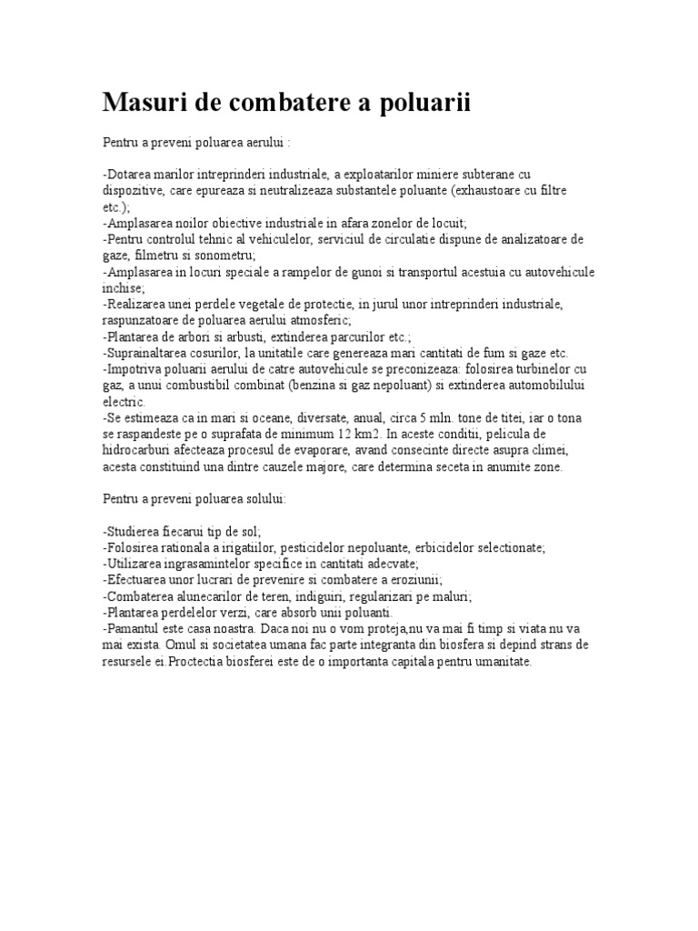 Prevenirea si combaterea poluarii aerului. Conservarea mediului incunjurator reprerzinta un ansamblu de masuri ce trebuie luate pentru prevenirea si inlaturarea poluarii a diminuarii efectelor ei asupra mediului prin folosirea celor mai potrivite tehnologii nepoluante prin actiuni care sa limiteze efectele distrugatoare ale unor fenomene naturale. Academia edu is a platform for academics to share research papers. Agentia de protectie a mediului are ca responsabilitate primara indeplinirea cererilor acestui act care specifica sa se stabileasca standarde privind calitatea aerului in cazul diferitelor substante. Tehnici de prevenire si combatere a poluarii aerului.