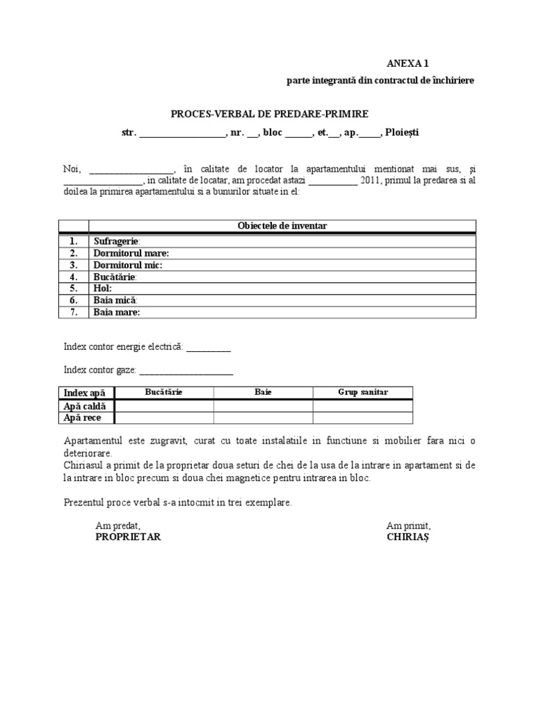 Proces verbal de predare primire. 1 anexa la contractul de inchiriere dintre. Un proces verbal de predare primire a inventarului unei locuinte inchiriate poate fi intocmit pe loc chiar fara a fi necesar un formular tipizat. Act de predare primire în cadrul proiectului consolidarea capacităţilor furnizorilor de pregătire profesională în sectorul apă şi canalizare în republica moldova aquaprof ii chişinău 29 iulie 2016 prin semnarea prezentului act d na gabriela damian timoșenco în calitate de.