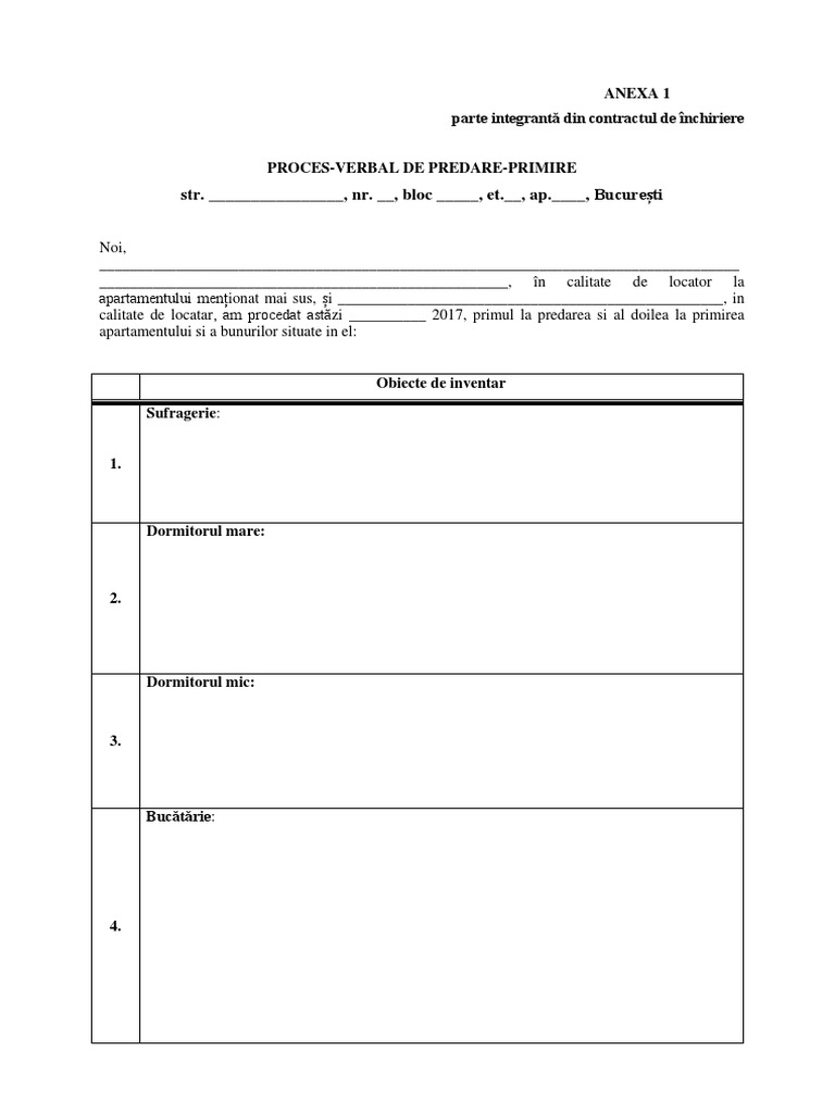 Proces verbal de predare primire inventar locuinta inchiriata. Important este ca chiriasul sa confirme existenta si starea mobilierului a electronicelor si electrocasnicelor plus a inventarului marunt dar costisitor dintr o locuinta astfel incat proprietarul sa poata fi despagubit de catre acesta in situatia in care o parte din inventar s a. Descarcati gratuit cea mai buna varianta de statute procuri contracte imputerniciri cereri decizii autorizatii coduri legi ordonante 2015. Proces verbal de predare primire nr încheiat astăzi condiții.
