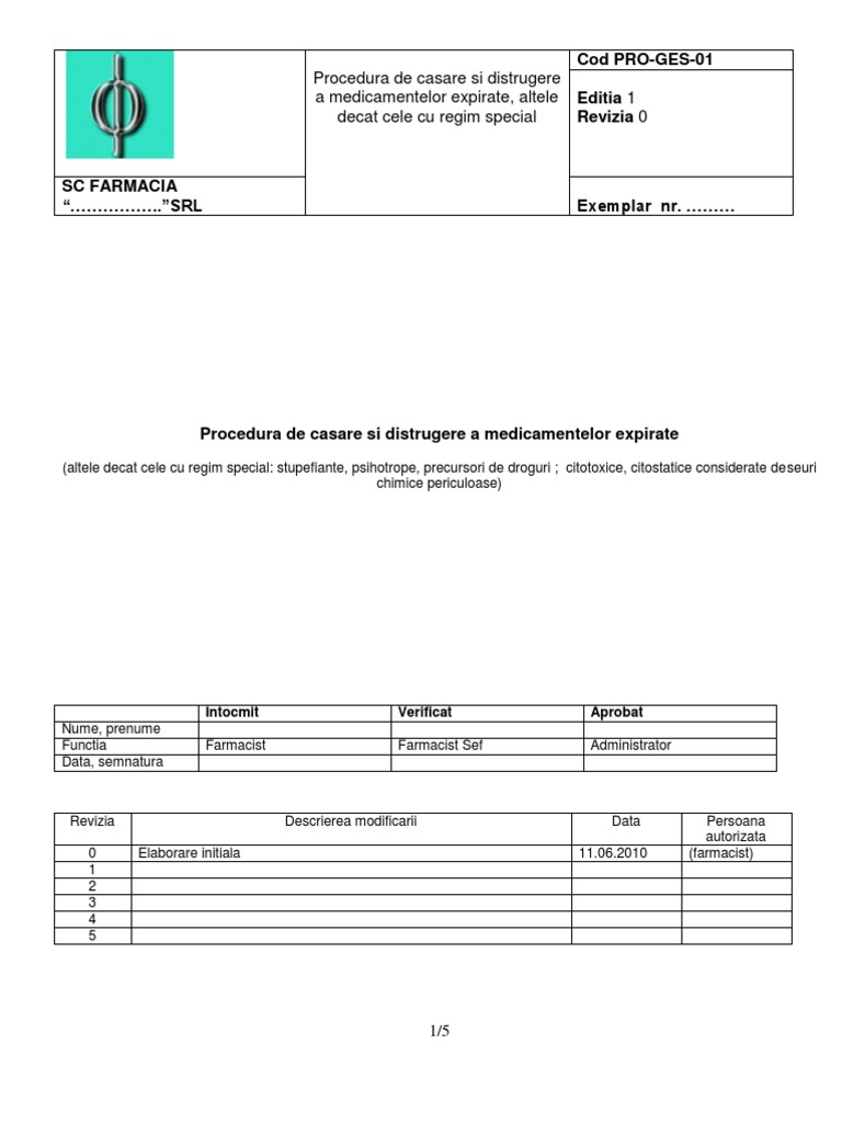 Pentru distrugere gestionarul asigura emiterea in 3 exemplare a procesului verbal de distrugere marfuri expirate care va contine datele de identificare ale produselor cantitatile de produse expirate âşi cauzele expirarii. Mentionez ca se intocmeste lista de inventar cu produsele expirate care cuprinde si numarul lotului si termenul de valabilitate proces verbal de predare catre o firma specializata care gestioneaza deseuri si care are obligatia distrugerii acestora produsele expirate nu pot fi imputate iar societatea are incheiata polita de asigurare. Produse expirate de nicolae nina valabil la 04 feb 2010. Proces verbal de constatare a marfurilor expirate perisabilitati model cu tabel limite adminisbile inclus.