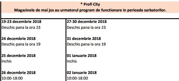 In rest mall urile supermarketurile si hipermarketurile functioneaza dupa un program normal al zilei de miercuri. Profi timisoara calea urseni104 106. Program magazine de crăciun şi revelion profi. 24 decembrie magazinele se vor inchide la ora 19.