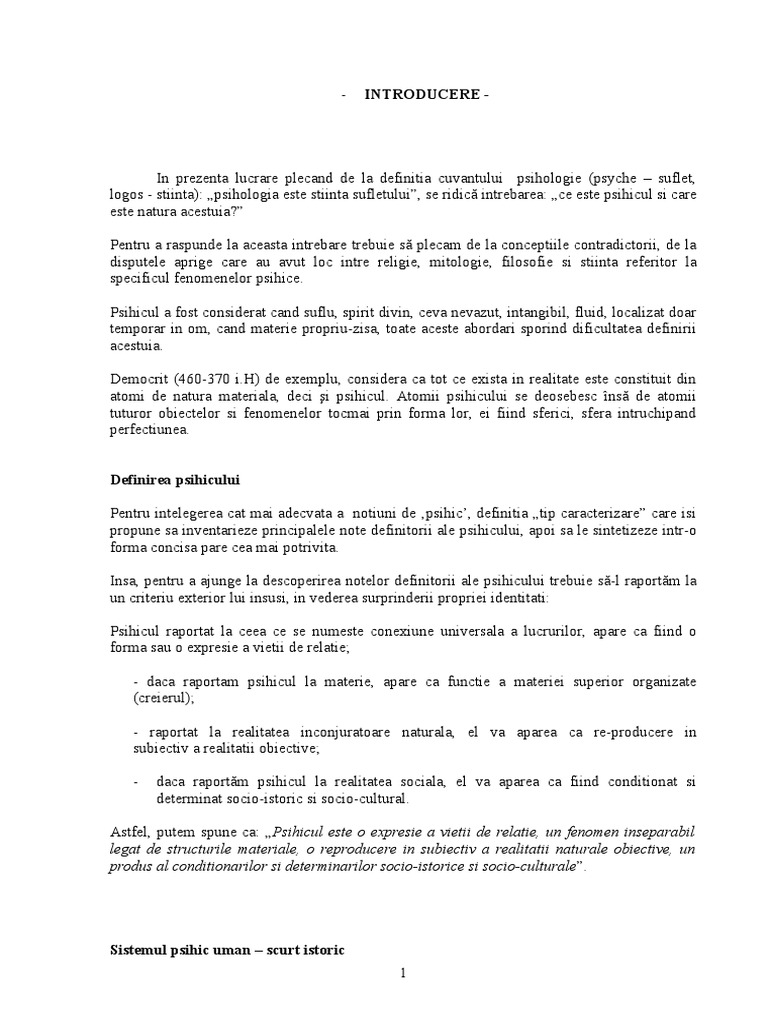 Referat psihicul si caracteristicile acestuia pentru liceu. Iti recomandam sa te uiti bine pe extras si pe imaginile oferite iar daca este ceea ce ti trebuie pentru documentarea ta il poti descarca. Aceasta natura contradictorie a psihicului a dat nastere multor controverse in legatura cu modul sau de organizare de structurare si de functionare care a dus la puncte de vedere diferite.