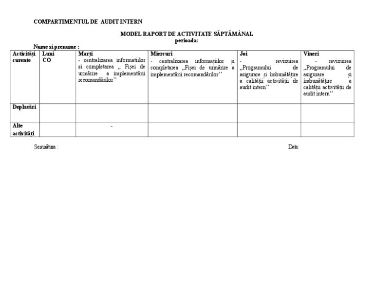 Foaia de activitate zilnică este un raport care oferă o imagine de ansamblu asupra utilizării zilnice a vehiculelor companiei. Descarca raport de activitate raport anual raport de audit raport de autoevaluare in educatie sau institutii publice. Observatii sugestii propuner ce mi a placut ce nu mi a placut ce merge bine ce merge prost ce m a impresionat cel mai mult astazi a fost eu as putea sa. Personal didactic de conducere personal didactic de îndrumare și control personal didactic auxiliar se menţionează categoria de personal perioada 1 septembrie 2010 31 august 2015 criteriul subcriteriul punctaj autoeval uare.