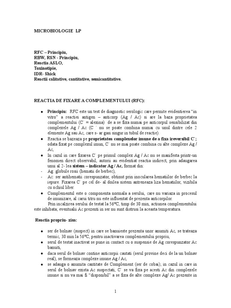 Reacția de fixare a complementului este o metodă folosită pentru determinarea serologică a leptospirozelor listeria monocytogenes coxiellei burnetii etc. Metoda de serodiagnostic in vitro fondata pe actiunea unui anticorp care va forma cu antigenul corespondent un complex dotat cu capa citatea de a fixa complementul. Reacţia de fixare a complementului rfc. Instrucțiunea de lucru in limba de stat.