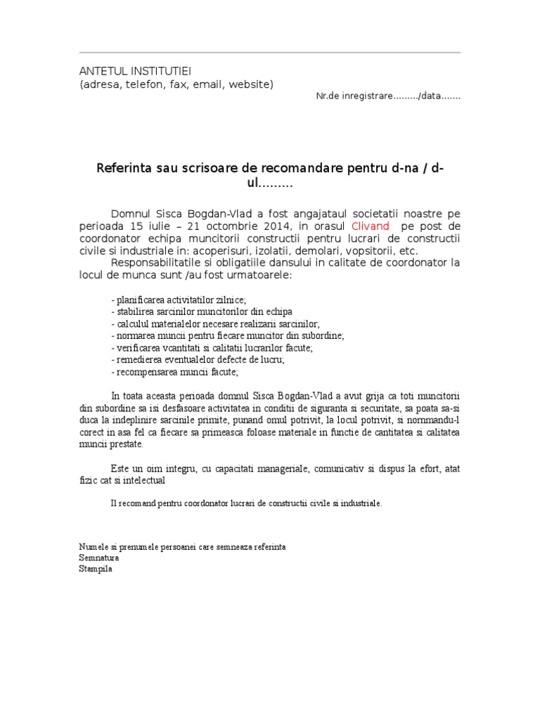 Scrisoarea de recomandare este un document pe care numeroși angajatori îl. Modele de contracte cereri acţiuni si alte acte. Pentru că este vorba despre un document formal la fel trebuie să fie și. Aceasta consta intr un comportament agresiv si abuziv fata de un angajat sau un grup de angajati.