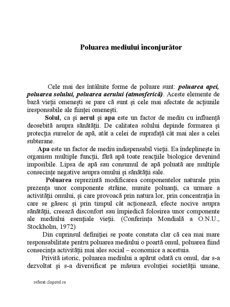 Acest referat descrie poluarea aerului. Profesor indrumator prezentat profesorului. Chiar dacă uneori poluarea mediului înconjurător este un rezultat al cauzelor naturale cum ar fi erupțiile vulcanice cea mai mare parte a substanțelor poluante provine din. Poluarea este contaminarea mediului înconjurător cu materiale care interferează cu sănătatea umană calitatea vieții sau funcția naturală a ecosistemelor organismele vii și mediul în care trăiesc.