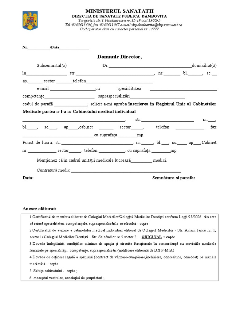 Actul de înființare a cabinetelor medicale este reprezentat de către certificatul de înregistrare în registrul unic al cabinetelor medicale care se întocmește de către direcţiile de sănătate publică judeţene a municipiului bucureşti. Sa fie inregistrate in registrul unic al cabinetelor medicale. 5 medicul este liber sa isi schimbe forma de exercitare a profesiunii sau sa isi modifice obiectul de activitate al cabinetului medical in functie de specialitatile. Cerere cabinete medicale asociate sau grupate.