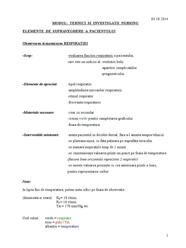 Respiratii pe minut valori normale. Celelalte semne vitale sunt tensiunea arterială temperatura corpului și pulsul. între 100 și 170 de bătăi pe minut. In cazul in care numarul de batai pe minut ale inimii ajunge la 150 sau mai sus persoana in cauza sufera de tahicardie supraventriculara. Dupa terminare se retine valoarea obtinuta se va asigura confortul termic si fizic bolnavului si se noteaza tehnica in foaia de temperatura cu un pix de culoare.