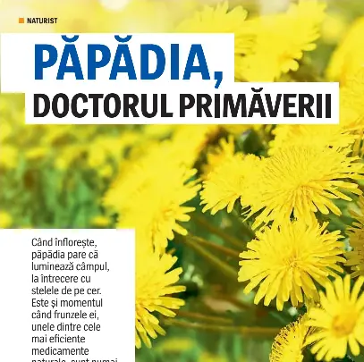 500 de grame de conopida gata curatata de cotor si frunzele exterioare. Este o rețetă excelentă pentru curățarea și întărirea organismului după lunile de iarnă. Cele mai cunoscute trăsături ale păpădiei sunt frunzele sale crestate rigide și aspre și florile. Salata din frunze de păpădie crude se prepară și se consumă de regulă primăvara când frunzele sunt fragede.