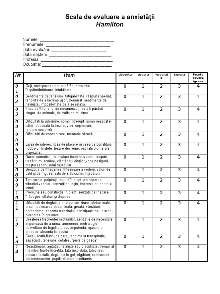 Exista variante cu 17 21 sau mai multi ittemi. Scala de evaluare a anxietăţii hamilton este o modalitate de cântărire la îndemâna oricui şi pentru uzul clinicienilor. Scala de anxietate hamilton este un instrument de evaluare clinică care este folosit pentru a măsura gradul de anxietate al unei persoane. Scala hamilton de evaluare a depresiei hamilton depression rating scale hdrs hamilton 1960 1967 reprezintă golden standardul pentru scalele de depresie neavând rival în psihiatria generală.
