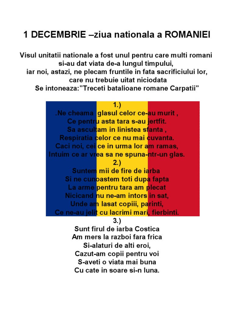 0 stele 0 review uri mentionez ca toate versurile imi apartin si le am compus in zilele premergatoare zilei nationale a romaniei 20 21 22 noiembrie 2008. Sarbatoriti romaneste fiti mandri ca sunteti romani. Proiect educational 1 decembrie. 29 noiembrie 2018 06 29.